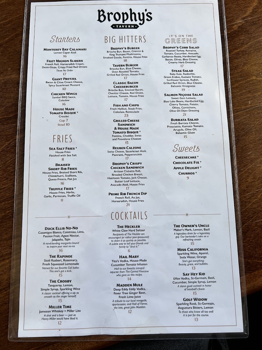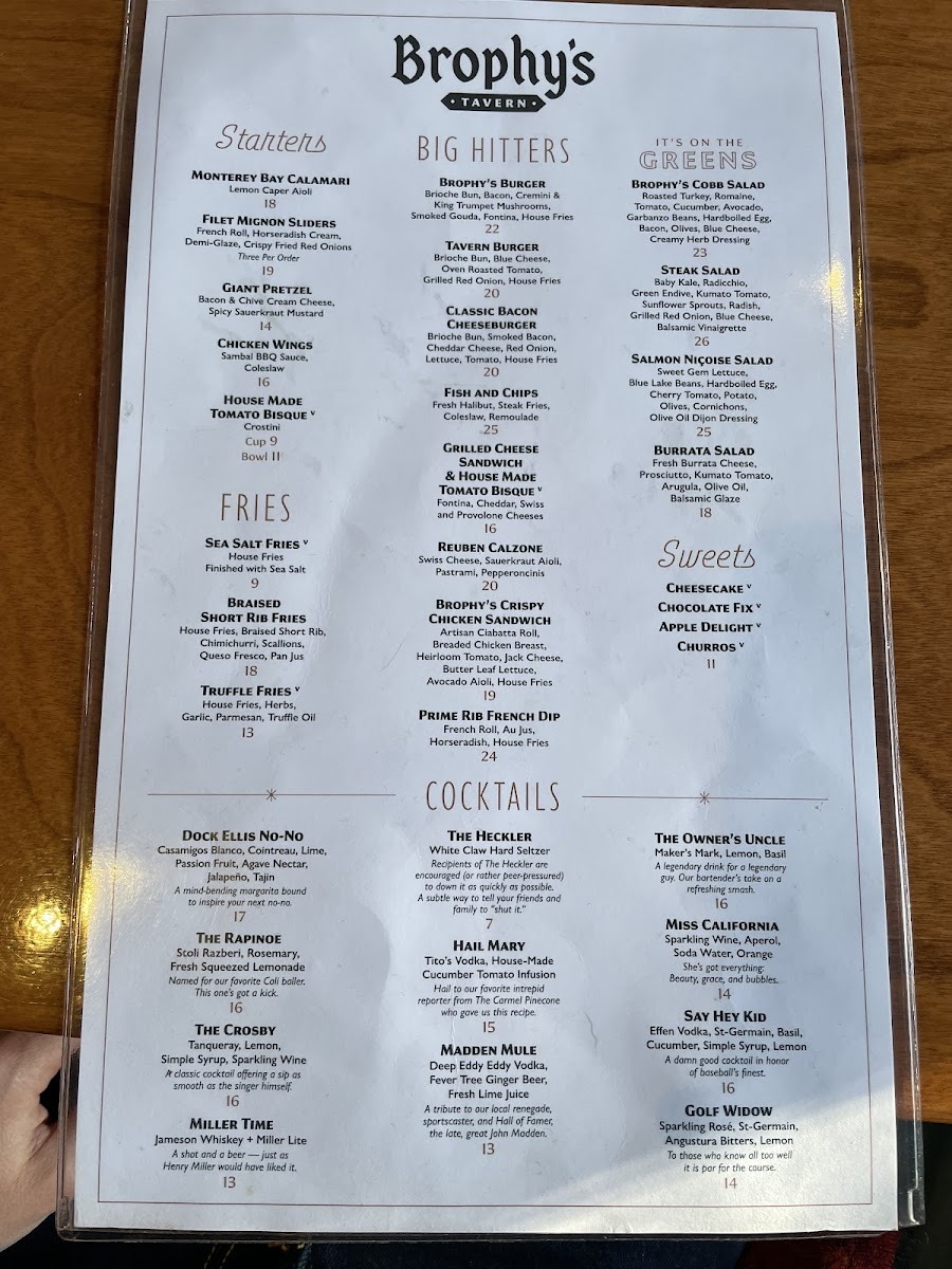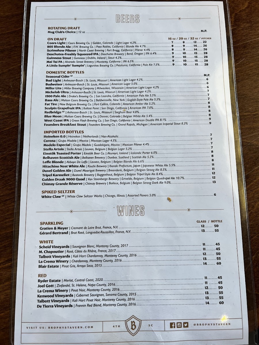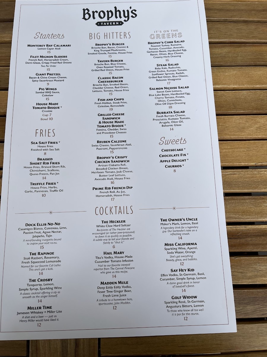 In summary, Brophy's Tavern is a beloved local haunt that encapsulates the spirit of Carmel-By-The-Sea. With its inviting atmosphere, hearty menu, and exceptional service, it promises a culinary experience that will leave you satisfied and eager to return for more. So grab a seat, raise a glass, and let Brophy's Tavern become your new favorite spot in town!